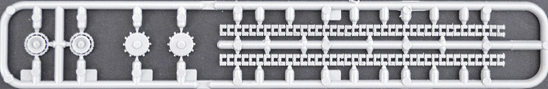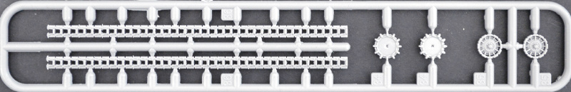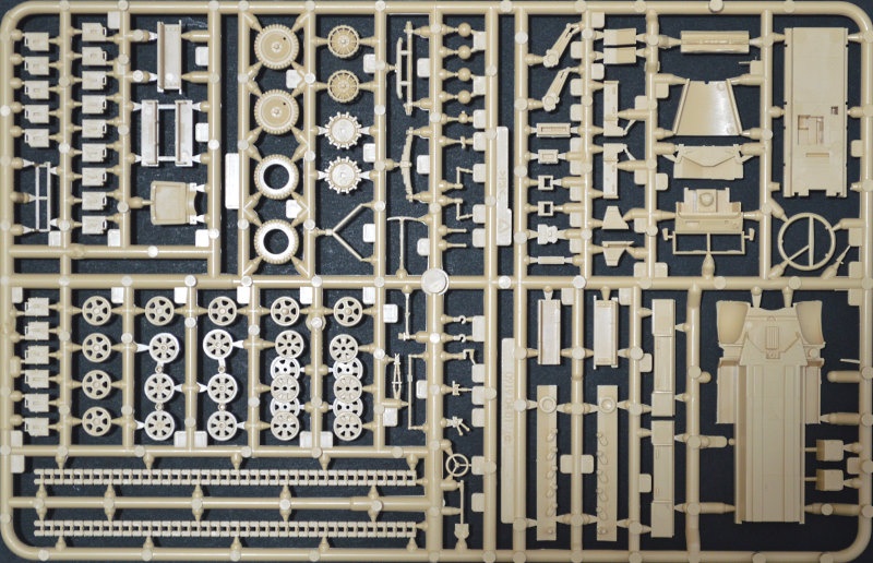 Im typischen Faltkarton mit einem neuen Cover befinden sich ein sandgelber und ein grauer Spritzgussrahmen, die Decals und Bauanleitung enthalten. Von den 107 enthaltenen Bauteilen werden 24 nicht benötigt, optionale Teile inbegriffen. Der Guss ist relativ sauber und weist kaum Sinkstellen auf. Fischhäute und unversäuberte Spuren der Formen sind verglichen mit dem Marder II öfter vertreten, halten sich aber im erträglichen Rahmen. Die Auswerfermarken befinden sich überwiegend an nicht oder schwer sichtbaren Stellen. Insgesamt sind noch ein paar Nacharbeiten erforderlich. Dafür ist die Detaillierung für diesen Maßstab gut und vor allem deutlich ausgeprägt, um sie nach dem Bemalen noch gut erkennen zu können.