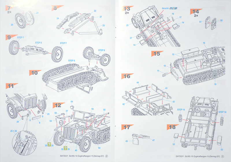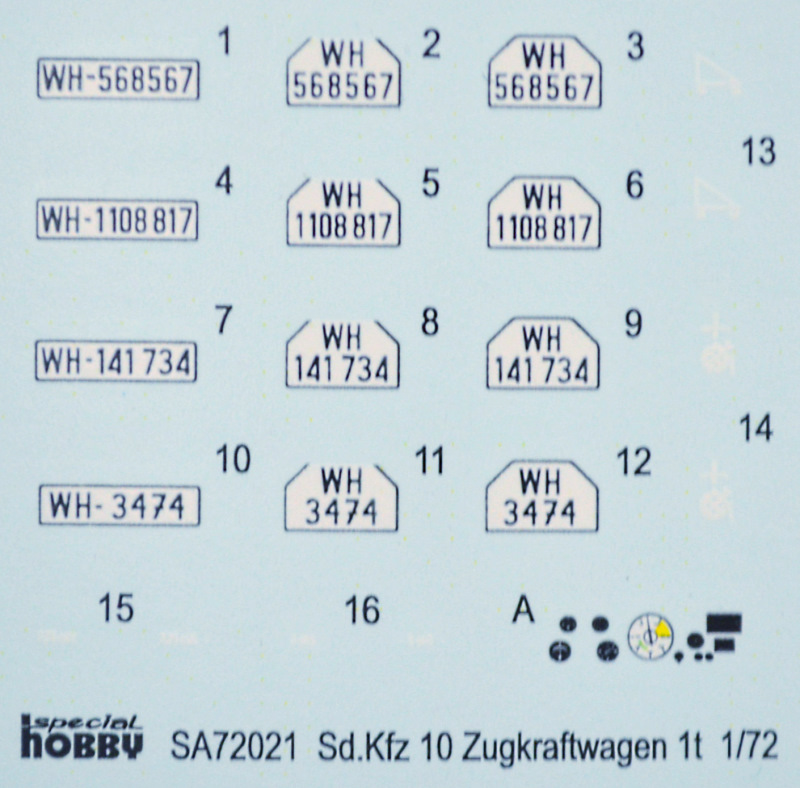 Die Bauanleitung und Decals wurden von Special Armour neu erstellt. Die Anleitung ist übersichtlich und farblich gestaltet. Auf Optionen und kleinere Details wird, wie oben bereits erwähnt, genauer eingegangen. Die insgesamt vier Bemalungsoptionen sind ebenfalls neu. Leider sind die genauen Wehrmachtseinheiten nicht benannt, dafür wird, soweit bekannt, auf genauere Details wie etwa Hersteller oder extra Nummernschild eingegangen. Angegeben wird das Farbsystem von Gunze Sangyo. Neben den Nummernschildern sind auch einige taktische Zeichen und das neu gestaltete Instrumentenbrett enthalten, welches sich von dem von MK 72 sichtlich unterscheidet. Die Decals sind sauber und versatzfrei gedruckt.
