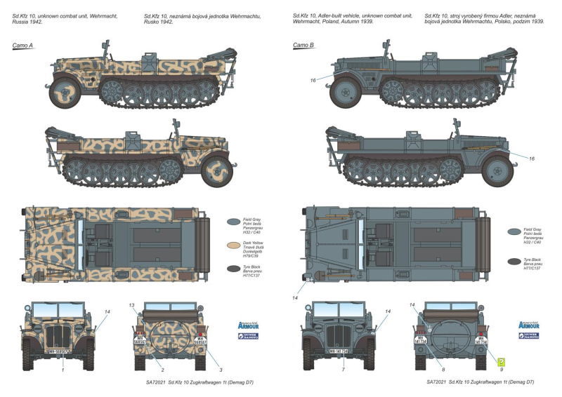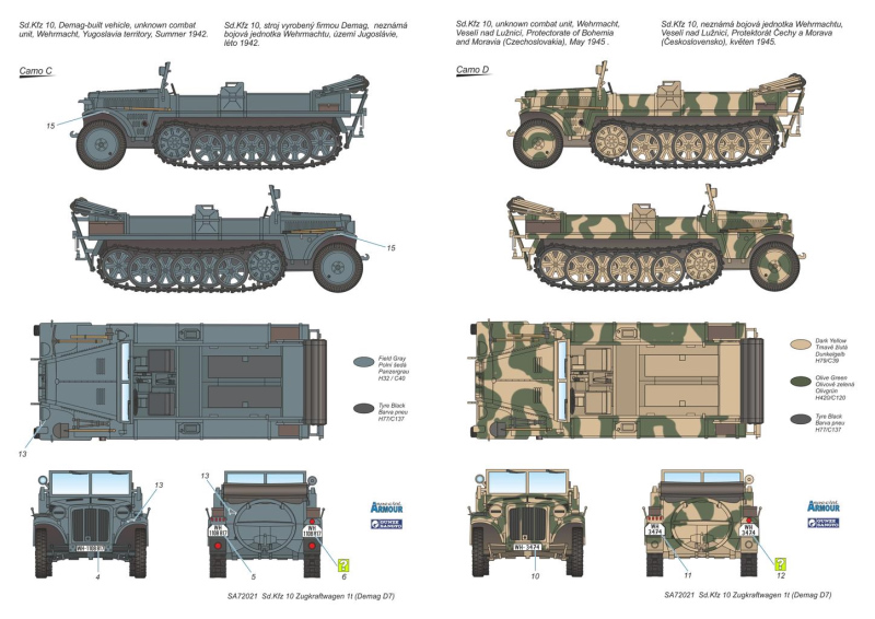 Vorbild: Das Sd.Kfz. 10 leichter Zugkraftwagen 1 t wurde ab 1934 von der Demag AG entwickelt, wobei es diverse Prototypen gab. Mit dem Muster D 6 wurden die ersten Serienfahrzeuge produziert, die Abschlussausführung war dann die D 7. Eine geplante Ausführung D 8 kam nicht über die Reißbretter hinaus. Die Variante D 7 wurde von 1938 bis 1944 zunächst von Demag, dann auch von Büssing NAG, Adler, MWC, MIAG, MNH und Saurer Wien gebaut. Obwohl die Produktion zugunsten des Zugkraftwagen 3 t eingestellt werden sollte, wurden bis einschließlich 1944 noch ca. 17.500 Fahrzeuge gefertigt.