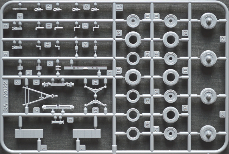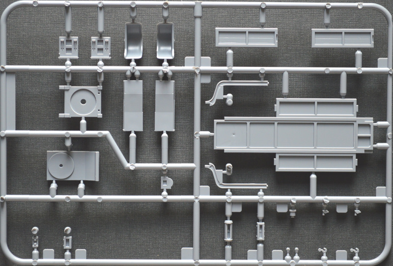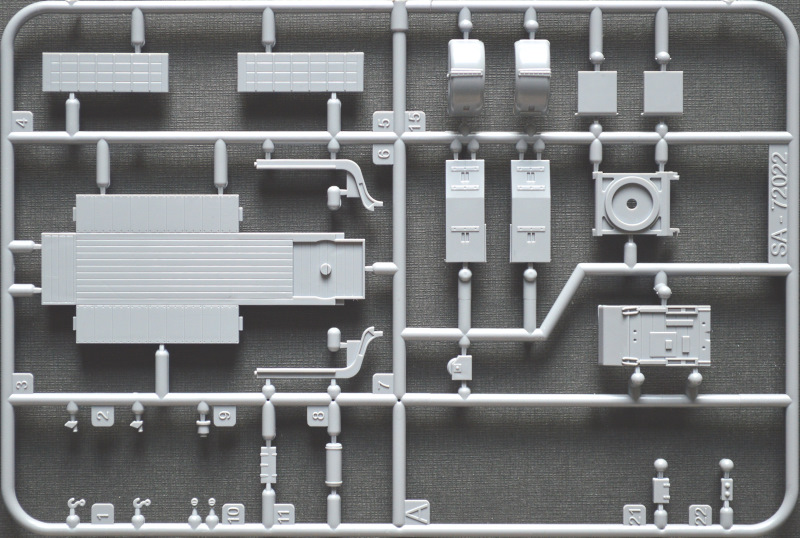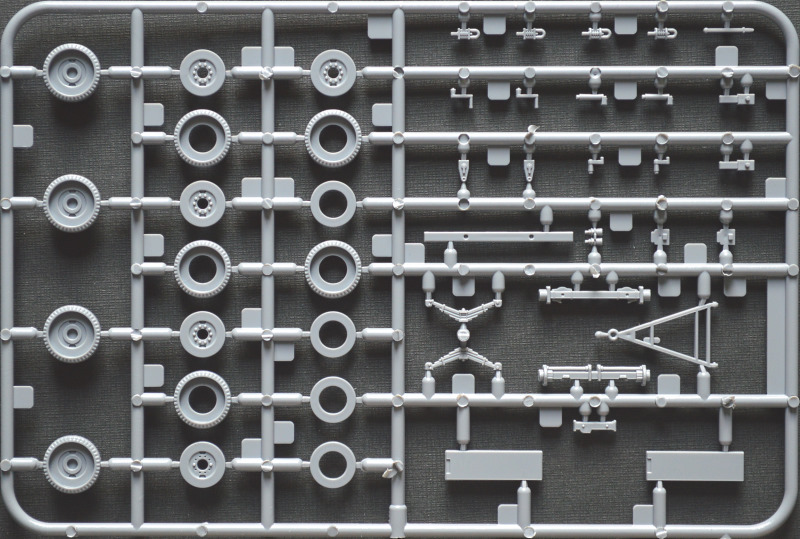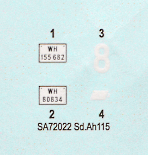 Bausatz: Nachdem Special Armour in 1/72 bereits mehrere Anhänger herausgebracht hat, wird nun auch dieser Sonderanhänger 115 angeboten. Im attraktiven, ausreichend stabilen Faltkarton befinden sich zwei graue Spritzlinge mit genau 70 Teilen, ein Decalbogen und die Anleitung. Die Abspritzung ist gut und die Auswerfermarken befinden sich allesamt an den Spritzrahmen. Ein paar Sinkstellen haben sich eingeschlichen, etwa an der Unterseite der Auflagefläche, die später nicht einsehbar ist, und an ein paar Teilen des Spritzrahmen B wie der Deichsel. Auch müssen noch ein paar Trennnähte der Gussformen versäubert werden. Die Details sind deutlich wiedergegeben, sodass auch nach der Lackierung alles erkennbar bleibt und weitere Washings und die Alterung erleichtert werden. Maßstäblich sind einige Teile wie die Rampen und Radabdeckungen zu dick geraten. Wer möchte, kann diese natürlich noch dünner schleifen. Auf Originalbildern sind Reifentypen mit unterschiedlichen, aber deutlich ausgeprägten Profilen zu sehen. Die Räder des Bausatzes verfügen formbedingt über kein Profil. Hierfür wurde in Zusammenarbeit mit CMK ein passender Rädersatz aus Resin herausgebracht. Positiv fällt auf, dass der Anhänger so gestaltet wurde, dass man ihn für den Transport oder für die Verladung (auch für das Zugfahrzeug) bauen kann. Außerdem lässt sich die Vorderachse eingeschlagen darstellen, sodass der Hänger problemlos in Kombination mit einem Zugfahrzeug dargestellt werden kann.