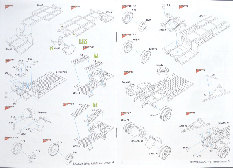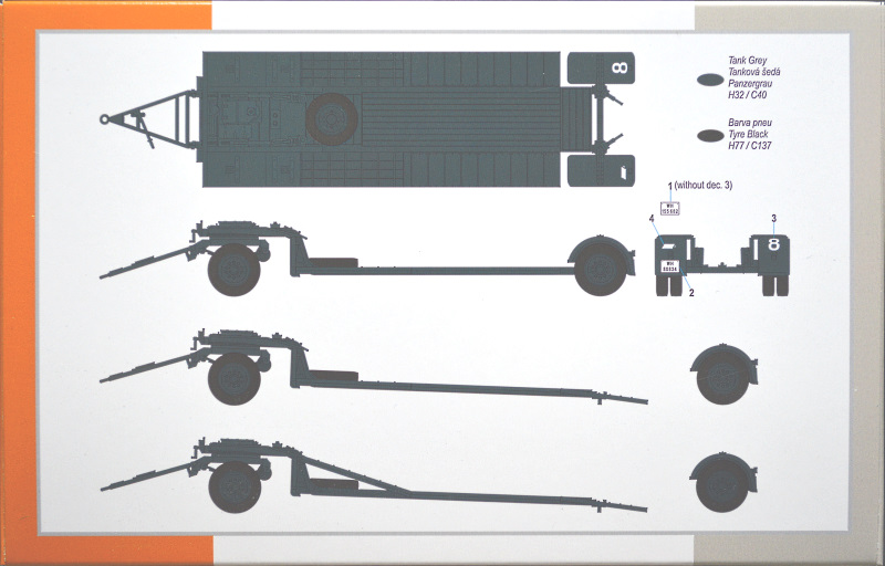 Anleitung/Bemalung: Die Bauanleitung ist typisch für Special Hobby farbig und leicht verständlich gehalten. Sie führt in 22 Schritten zum fertigen Modell, wobei auf die Optionen der Verladerampen genauer eingegenagen wird. Die Bemalungsanleitung gibt zwei nicht näher erläuterte, dunkelgraue Hänger an, einer davon mit einer großen weißen "8". Als Farbsystem wird Mr. Hobby bzw. Gunze genannt. Die wenigen Decals sind tadellos gedruckt.
