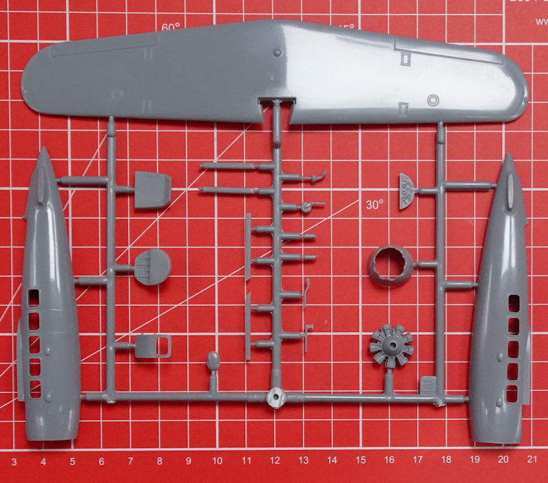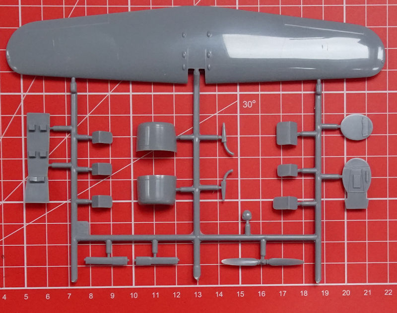 Die Abspritzung der Bauteile ist tadellos. Der Bau beginnt mit dem einsitzigen Cockpit. Hier kann man noch ein paar Sitzgurte ergänzen. Das mit erhabenen Strukturen versehene Instrumentenbrett muss selbst bemalt werden. Hier hilft die Trockenmalmethode weiter. Weiter hinten werden nur zwei Fässer auf dem Rumpfboden montiert. Die Rumpfseitenfenster werden von außen eingeklebt. Nur bei dem der Tür muss man sich vorsehen. Alle anderen werden später überlackiert.