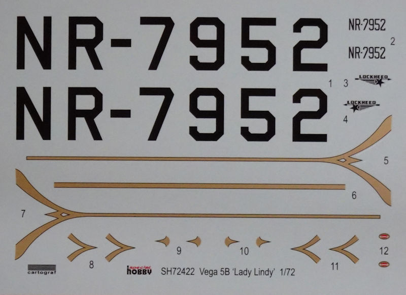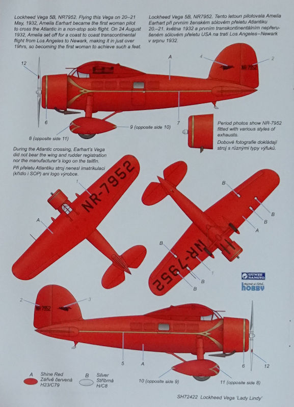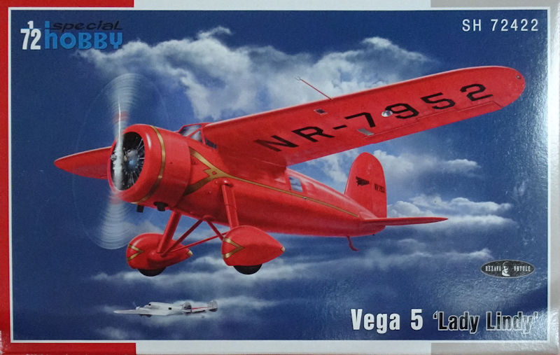 Bausatz: Unter dem Label MPM erschien die Lockheed Vega DL-1 in 1/72 2003 aus einer Stahlform. Seit dem gab es einige, teils modifizierte, Auflagen dieses Bausatzes. Nun gibt es diese spezielle Auflage der "Lady Lindy" von special hobby. In der attraktiven aber unpraktischen Schüttbox befinden sich die drei bekannten grauen Spritzlinge mit 66 Teilen, ein Klarsichtrahmen mit elf Teilen, ein Resinteil, ein Decalbogen und die mehrfarbige Bau- und Bemalungsanleitung. Ein paar Teile sind für andere Versionen bestimmt und wandern daher in die Restekiste.
