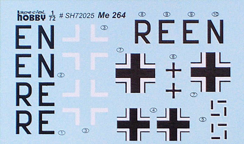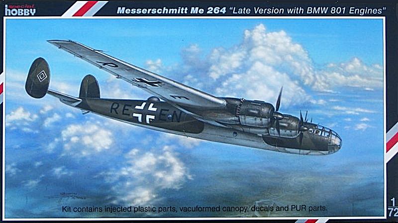 Vorbild: Die Messerschmitt Me 264 entstand als so genannter Amerikabomber. Ihren Erstflug hatte die Me 264 V1 am 23. Dezember 1942. Ab 11. August 1943 wurde das Flugzeug von Jumo 211 auf BMW 801 Triebwerke umgerüstet. Weitere Modifikationen wurden durchgeführt. Allerdings behielt die V1 während ihres Lebens immer nur kurze Randkappen an den Tragflächenenden. Somit betrug die Spannweite immer 38,9 m. Am 18. Juli 1944 wurde diese Maschine bei einem Bombenangriff zerstört. Die noch im Bau befindlichen Versuchsmuster V2 und V3 wurden niemals fertig gestellt.