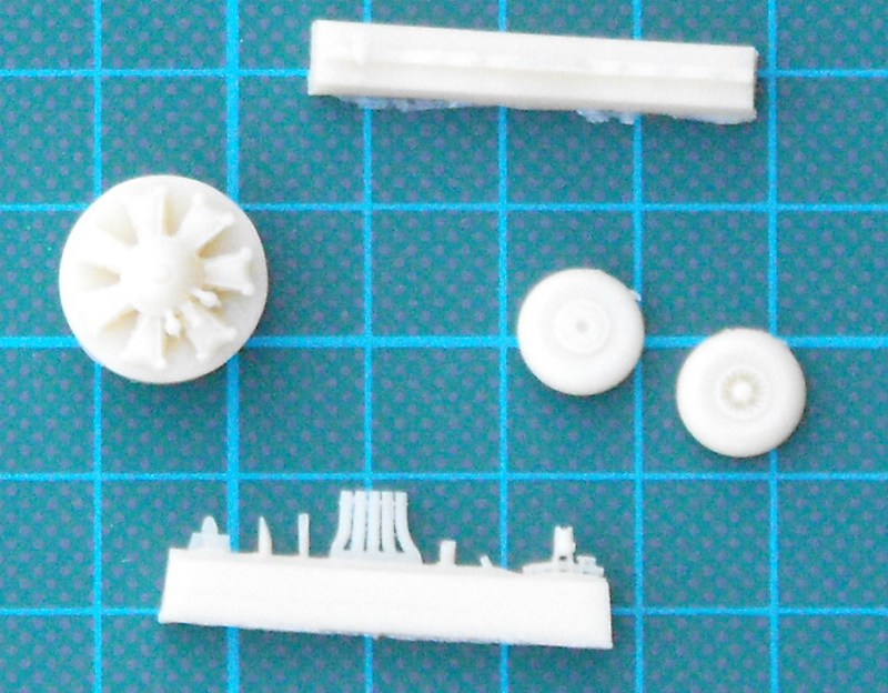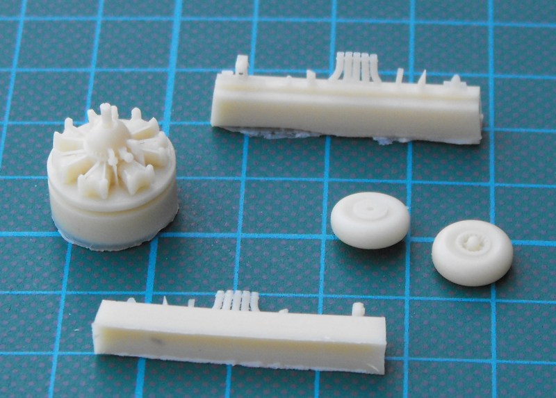 Die Aufnahme des Resinmotors muss noch ein wenig passend geschliffen werden. Angesichts des dabei anfallenden ungesunden Feinstaubs eine undankbare Aufgabe. Immerhin gibt es in der Bauanleitung die erforderlichen Maße dafür. Im Bereich der Motorverkleidung werden noch kleinste Resinteile verbaut.