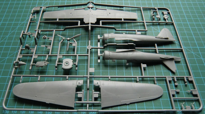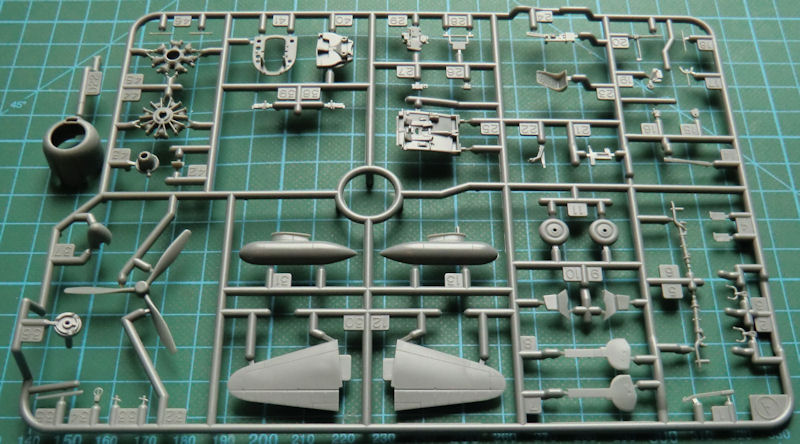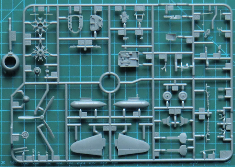 Die Spritzgussteile sind sehr fein und recht komplex reproduziert. Das gilt auch insbesondere für das Cockpit. So hat z.B. der Sitz feine aufmodellierte Sitzgurte und das Instrumentenbrett schöne Strukturen. Das setzt sich natürlich an den Rumpfinnenseiten und dem Cockpitboden fort. Der Motor entsteht aus sieben Teilen und verschwindet hinter der komplexen einteiligen Motorhaube.