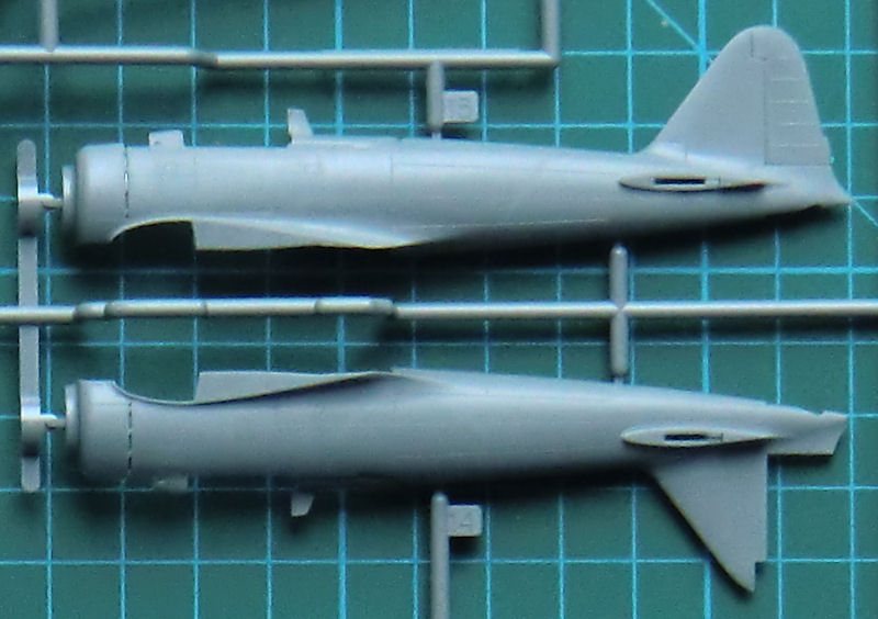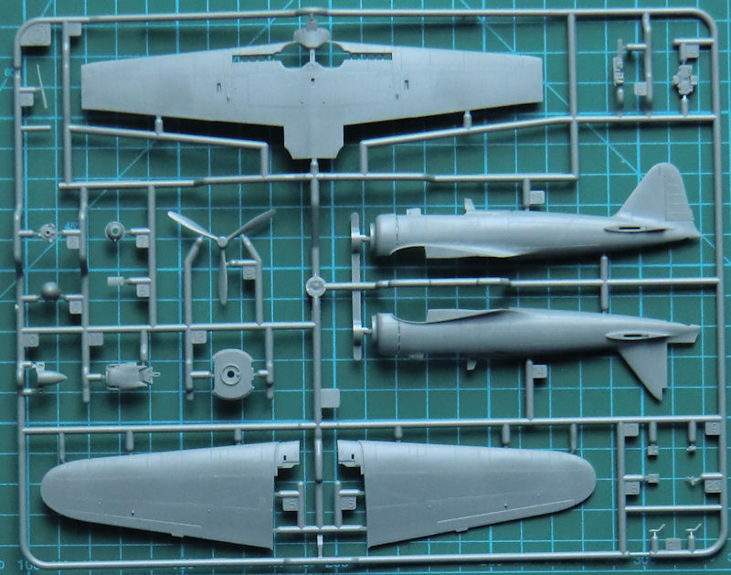 Die Tragfläche besteht aus drei Teilen. So gibt es eine Unterseite mit der richten V-Form und zwei oberen Hälften. An letzteren sind die Querruder komplett anmodelliert. Einziger verschmerzbarer Nachteil ist, dass die Tragflächenenden nicht alternativ klappbar sind oder separat beiliegen. So kommen aber die Linien der frühen Zero besser rüber. Das Höhenleitwerk besteht aus zwei Teilen. Hier gibt es auch scharfe Hinterkanten. Tamiya hat auch beim Seitenleitwerk das Ruder einseitig anmodelliert. Das Fahrwerk samt deren Schächten sehr detailliert. Tamiya liefert eine Kanzel die optional offen angeklebt werden kann. Weiterhin gibt es noch einen Zusatztank.
