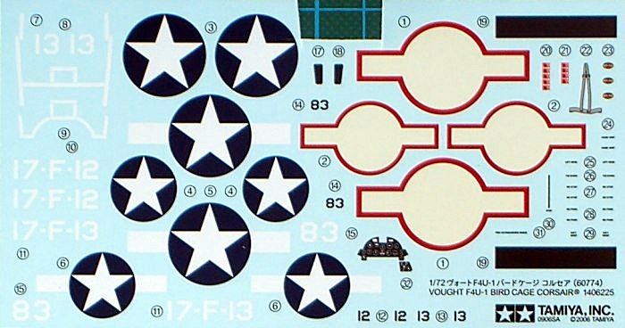 Bei meinem Bausatz fiel mir sofort ins Auge, dass da bestimmte Sachen geschwärzt bzw. aus dem Decalbogen entfernt wurden. Einen kurzen Moment dachte ich an Hakenkreuze - nein es waren die Staffelsymbole der VF-17, der erfolgreichsten US Navy-Einheit aller Zeiten. Offensichtlich ist bei Dickie-Tamiya jemand übers Ziel hinausgeschossen! Der Bausatz ist in Deutschland nur unvollständig und ich halte es für einen Mangel (Mir ist nicht bekannt, dass Piraten der Karibik auf einer Indexliste steht!).