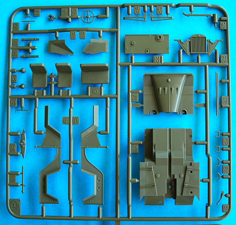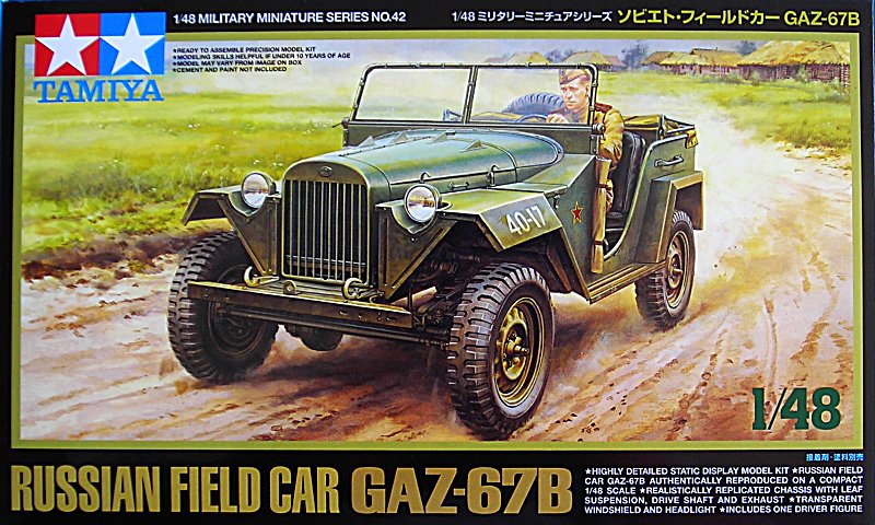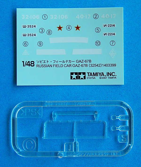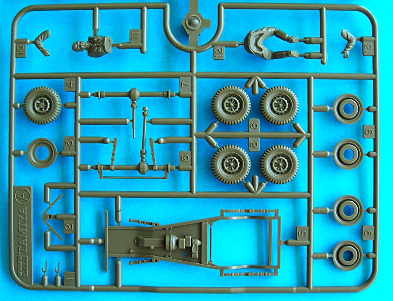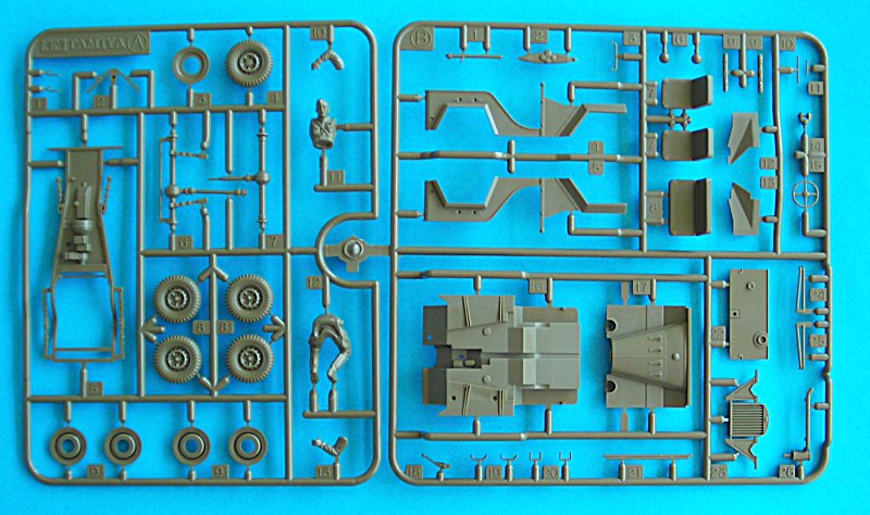 Das Modell stellt einen GAS-67b dar. Auf zwei kleinen Spritzrahmen nebst einem klaren für Scheiben und Scheinwerfer präsentieren sich die tamiyatypischen Bauteile. Sogar eine Fahrerfigur ist enthalten. Schön finde ich, dass Tamiya trotz der wenigen Rahmen keine Faltschachtel, sondern einen Karton mit oberem und unteren Deckel verwandt hat! Ich sehe keine Schwierigkeiten beim Bau und erste Probepassungen bestätigen dies. Es liegen 3 Bemalungsvarianten bei, die jedoch eher generisch und ohne weitere Informationen sind.