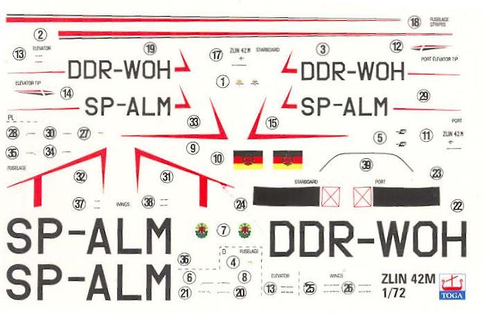 Bausatz: Eigentlich sollte dieser Bausatz schon im Mai 2005 (Siehe Baubericht!) bei TOM Modellbau (www.tom-modellbau.de) erscheinen. Auch bei kleinen Herstellern kommt es hin und wieder zu Verzögerungen. In der ersten Auflage gibt es noch die bekannten schwarzen Spritzgussteile vom Fertigmodell (somit gibt es auch einen Ständer). Eine Grundierung der Teile ist für den Bau recht hilfreich. Die Bauanleitung ist übersichtlich. Sie enthält allerdings keine Farbangaben für die Kabine. Nach meinen Informationen sind die Sitze mit hellgrauem Leder bezogen. In der gleichen Farbe sind die Innenpolster. Der Steuerknüppel ist weiß mit schwarzem Gummigriffstück. Die Fensterrahmen sind von Innen weiß. Angaben über das Buggewicht fehlen. Ich kann mich erinnern, dass meine erste Z-42M sehr viel Blei erhielt, der gesamte Bugraum wurde genutzt. Der Decalbogen ist nicht sehr groß, enthält jedoch alle Wartungsangaben. Die DDR-Fahne und das GST-Abzeichen können allerdings in der Ausführung nicht überzeugen. In Kürze wird es einen Zubehörsatz (Decal) zu dem Thema Flugzeuge der GST geben.