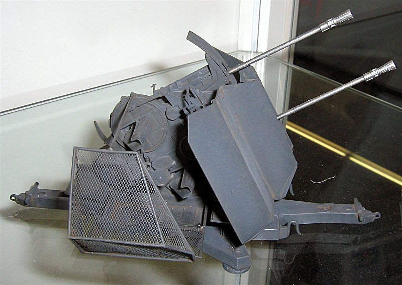 Zum Original: Der 3,7-cm-Flak-Zwilling 43 war eine Weiterentwicklung der 3,7-cm-Flak 43, deren Feuergeschwindigkeit durch das zweite Rohr verdoppelt wurde. Da sich das Gewicht der Flak ebenfalls verdoppelte, musste ein neuer Zweiachsanhänger zum Transport verwendet werden. Sie wurde in drei Berliner Werken (DWM, Gustav Appel, Dollberg), im Metallwerk Creussen, im Maschinen- und Apparatebau Eustergerling in Bielefeld und im Neumark-Gerätebau in Landsberg produziert.