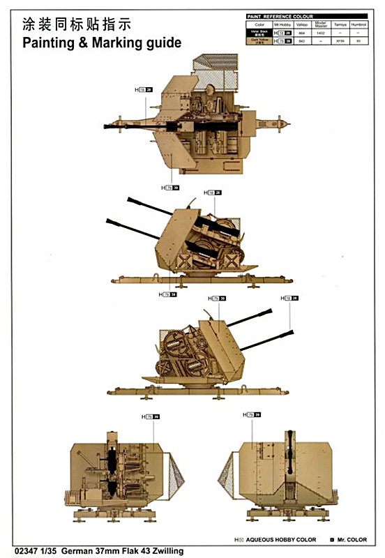 Zum Modell: Ohne große Ankündigung erschien von Trumpeter im Maßstab 1:35 ein neuer Bausatz vom deutschen Flakzwilling 43. Bislang gab es dieses Modell nur von einschlägigen Kleinserien Herstellern (Eagle Cz, Puchala). Im Bausatz sind: sieben Gießrahmen - mit 150 sauber, in hellgrau abgespritzten Plastikteilen-, ein kleiner Fotoätzteilbogen, ein farbiges DIN A4 Blatt mit Farb- und Markierungsangaben und die Bauanleitung enthalten.