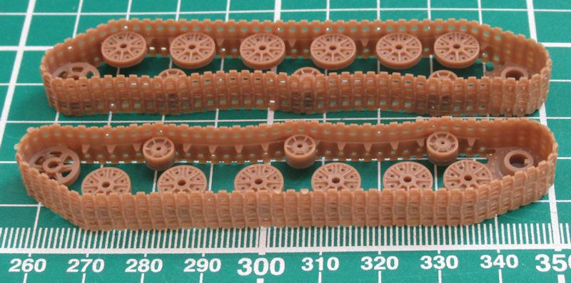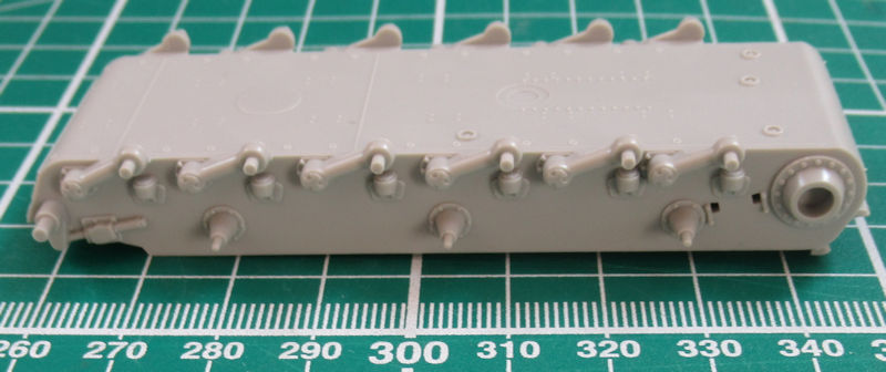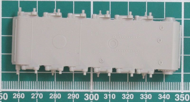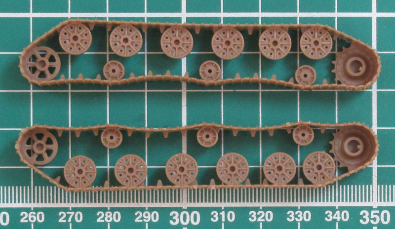 Die Abspritzung der Teile entspricht dem heutigen TRUMPETER-Standard für diesen Maßstab. Man hat einige Lauf- und Stützrollen mit der Kette verbunden. Dieses erleichtert den Zusammenbau. Die Kette ist zwar durchbrochen aber leider besitzt sie von innen keine Details. Leider hat man die Schwingarme an die Unterwanne angegossen. Das Fahrwerk wird durch die äußeren Laufrollen komplettiert.
