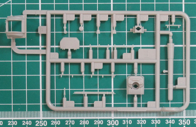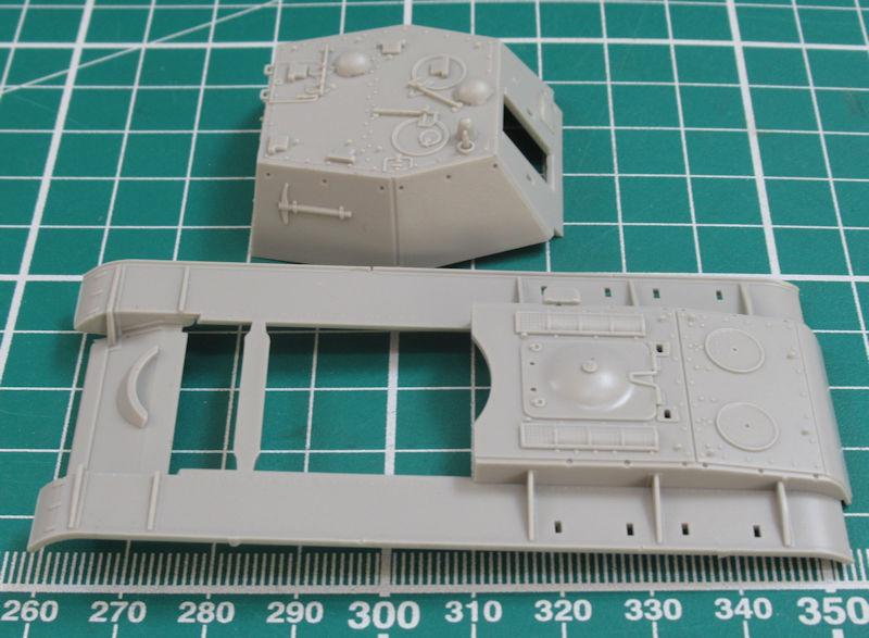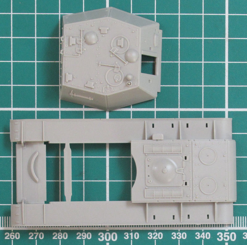 TRUMPETER hat die Oberwanne recht gut detailliert. Allerdings hat man viele Sachen mit anmodelliert. Das erschwert die Bemalung. Der Aufbau besteht aus einem Teil. Für dessen Herstellung hat man ein recht komplexes Werkzeug benutzt. Ein paar Haltegriffe werden separat angeklebt. Das gilt auch für die Abschleppösen.