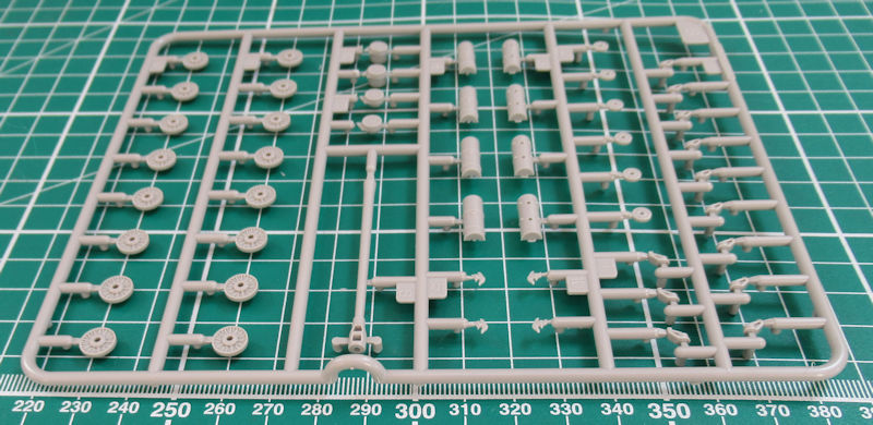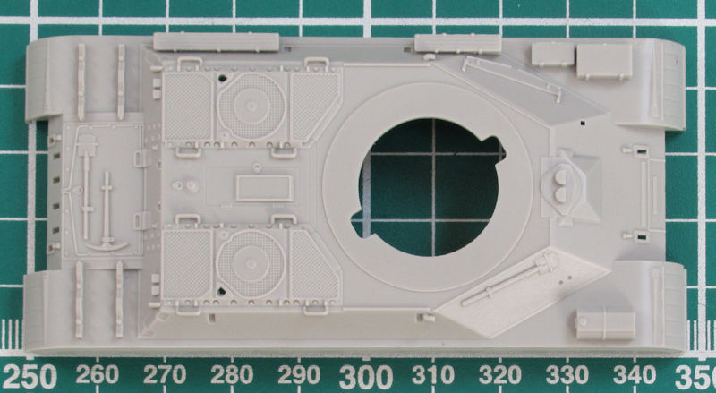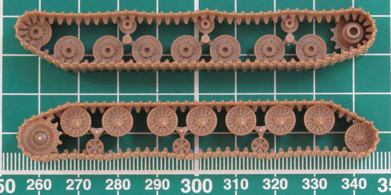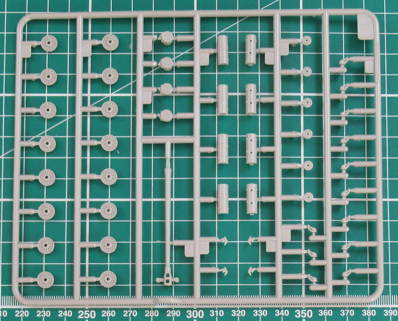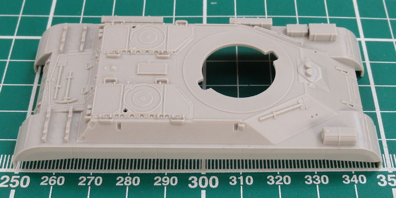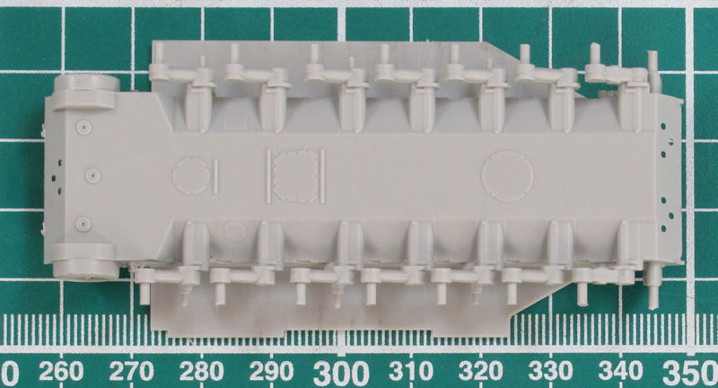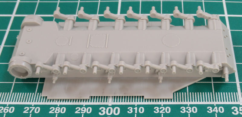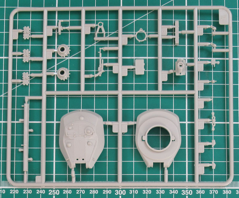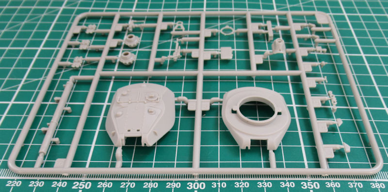 Die Abspritzung und Detaillierung der Teile ist voll auf der Höhe der Zeit. Man hat hier wieder einige Teile sinnvoll zusammengefasst. Das betrifft insbesondere das Fahrwerk. So beginnt der Bau aus ganz klassisch mit der Wanne und dem Fahrwerk. Die Schwingarme sind anmodelliert. Die inneren Laufrollen werden einzeln angeklebt.