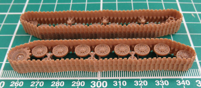 Aus jedem Kettenteil müssen noch drei Verbindungsstege herausgeschnitten werden. Leider sind die Innenseiten der Ketten platt. Das beeinträchtigt die Optik doch ein wenig. Die beiden äußeren Tanks und der obligatorische Holzstamm dürfen nicht fehlen. Das die Mündung der kleine D-25T-Kanone hohl ist, das dürfte klar sein. Das Fla-MG sieht recht ordentlich aus.