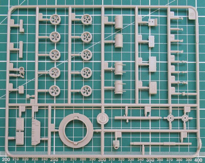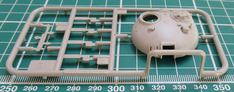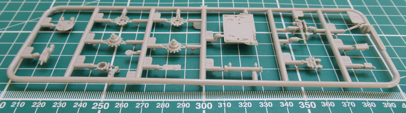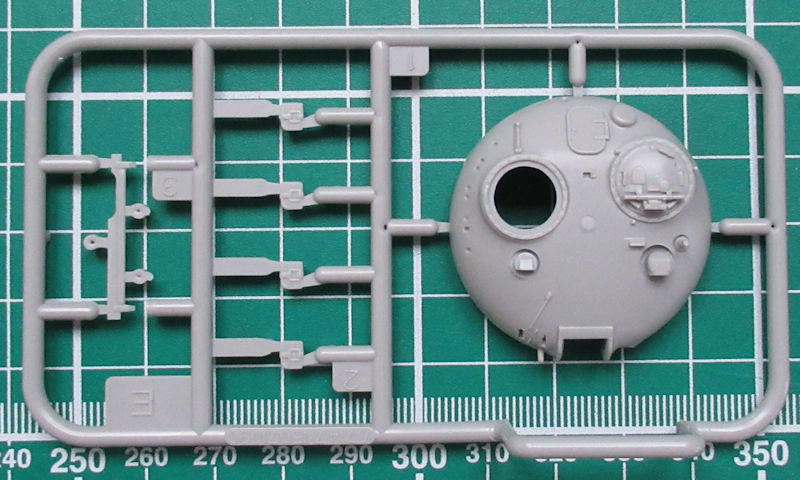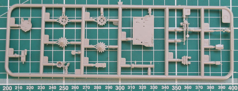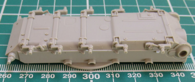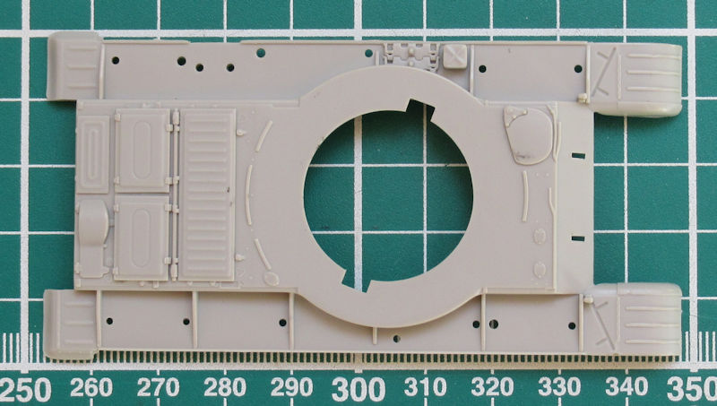 Die Ober- und Unterwanne sind jeweils ein Bauteil und recht gut mit Details versehen. Die Schwingarme sind an die Unterwanne anmodelliert. Als Einzelteil gibt es die Frontpanzerung für die Unterwanne. Die inneren Laufrollen sind einzeln vorhanden. Auf der Oberwanne werden die Staukästen einzeln aufgeklebt.