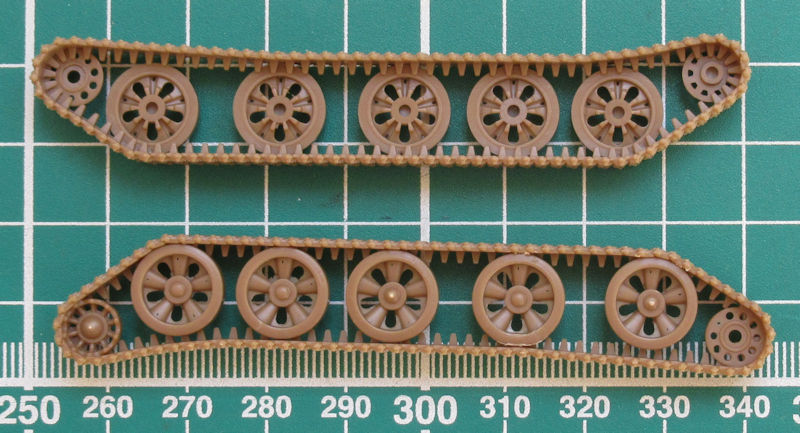 Schnell erkennt der Betrachter, dass der Bausatz vereinfacht wurde und sich auch an Einsteiger richtet. Das Laufwerk wurde vereinfacht und die äußeren Laufrollen bilden mit der Kette eine Einheit. Leider leidet darunter etwas die Detailierung der Innenseite der Kette. Immerhin sind die charakteristischen Zähne vorhanden.