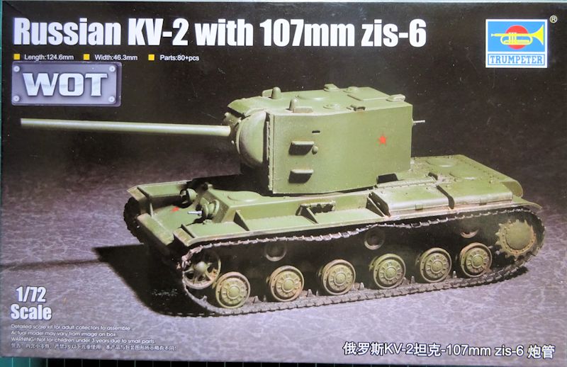 Bausatz: Trumpeter hat das altbekannte Modell des sowjetischen schweren Panzers KW-2 mit einer dem Spiel WoT angepassten Bewaffnung herausgebracht. Im Spiel gehört der KW-2 zu den schweren Panzern der UdSSR auf Stufe 6.