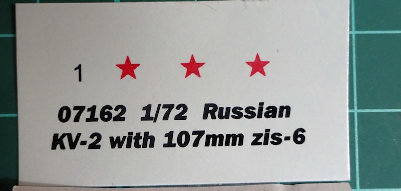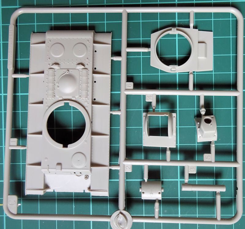 In der Schachtel mit dem Modell als Deckelbild befinden sich eine Bodenplatte, die Bauanleitung, Abziehbilder, Gummiketten und Abschleppseile sowie sechs hellgraue Gießäste. Die Bauanleitung führt in 10 übersichtlichen Schritten zum fertigen Modell. Der Bausatz ist gut detailliert, so wurde zum Beispiel an der Panzerwanne und am Turm die aufgeraute Fläche des Panzerstahls wiedergegeben. Die Kanone hat eine aufgebohrte Mündung was das Modell realistischer aussehen lässt. Es gibt an den Teilen ein paar Grate, die vor dem Zusammenbau entfernt werden müssen. Dem Bausatz liegt auch die Kanone und dazugehörige Blende für die 152 mm Kanone bei, so dass man auch diese Variante bauen kann.