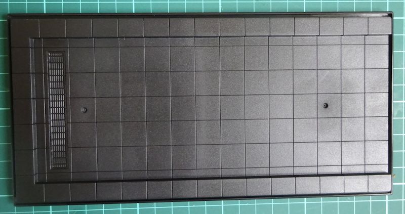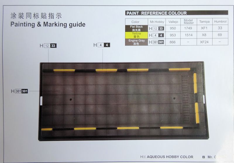 Als Besonderheit an diesem Bausatz sticht die große Bodenplatte hervor. Sie ist aus schwarzem Kunststoff und stellt den Garagenboden in WoT dar. Es wird eine etwas abgesenkte Stellfläche gezeigt, die auf drei Seiten von einer Kante umschlossen ist. An der einen Seite sind Ablaufgitter zu sehen und die ganze Fläche besteht aus quadratischen Betonplatten. Zu der Grundplatte gibt es eine separate, farbig gedruckte Bemalungsanleitung.
