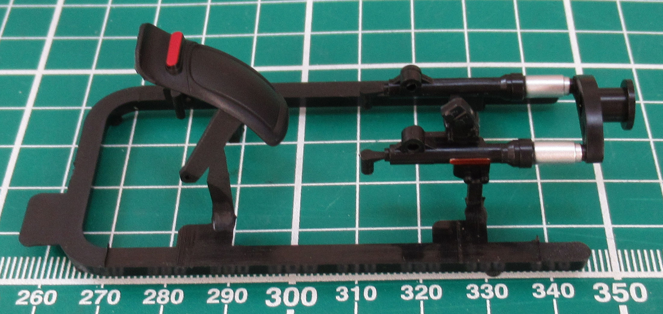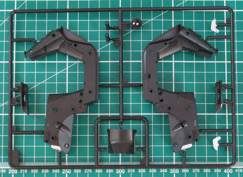 Für die beiden Spiegel gibt es Aufkleber und darin kann man sich sogar sehen. Neben den beiden Ständern gibt es Fußrasten für den Sozius. Einzig die Bowdenzüge kann man noch ergänzen.