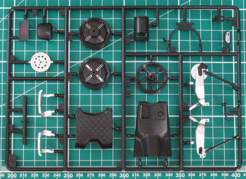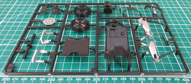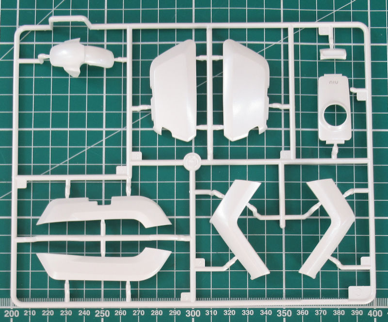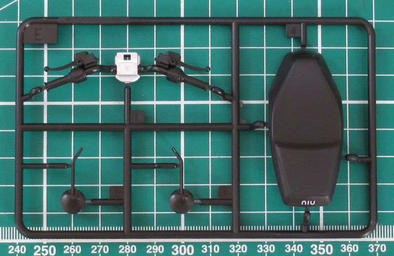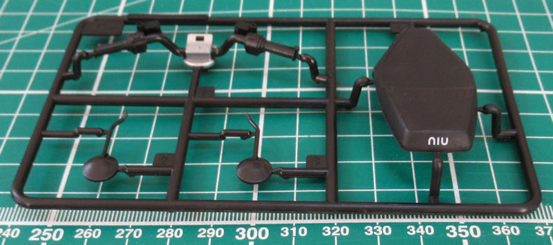 Bausatz: Dieser 1/12 Kit ist eine Überraschung für mich gewesen. Es wirkt für mich als Auftragsarbeit für NIU. TRUMPETER liefert in einem sehr stabilen Karton und darin befinden sich wunderschön lackierte Teile. Diese verteilen sich auf fünf Spritzgussrahmen mit 41 Teilen, zwei klare Rahmen mit jeweils einem Teil, zwei Gummireifen, drei Schraubenfedern, zwei Achsen aus Stahl, Aufkleber und die Bauanleitung. Alle Teile können ohne Klebstoff dauerhaft zusammengefügt werden.