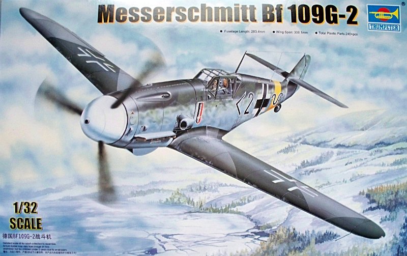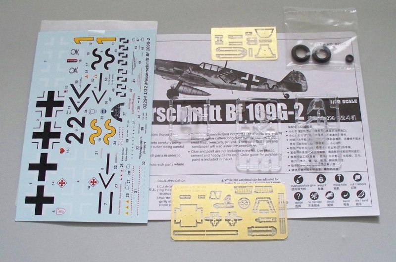 Bausatz: Trumpeter aus China hat sich der frühen Bf 109 G-2 gewidmet und einen hochwertig detaillierten Bausatz des Klassikers im 32er Maßstab auf den Markt gebracht. Neben 240 Plastikteilen gesellen sich noch Reifen aus guten Vinylmaterial sowie zwei Platinen mit Messingteilen für die Sitzgurte,den Kühlergrill, den Befestigungsgurt für den Zusatztank. Außerdem Teile für Ruderpedale, Sitzschale, der Rückenpanzerung usw. Auch die Klarsichtteile verdienen ihre Bezeichnung.