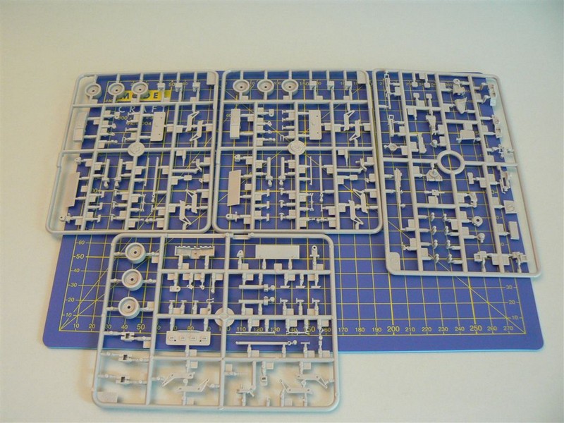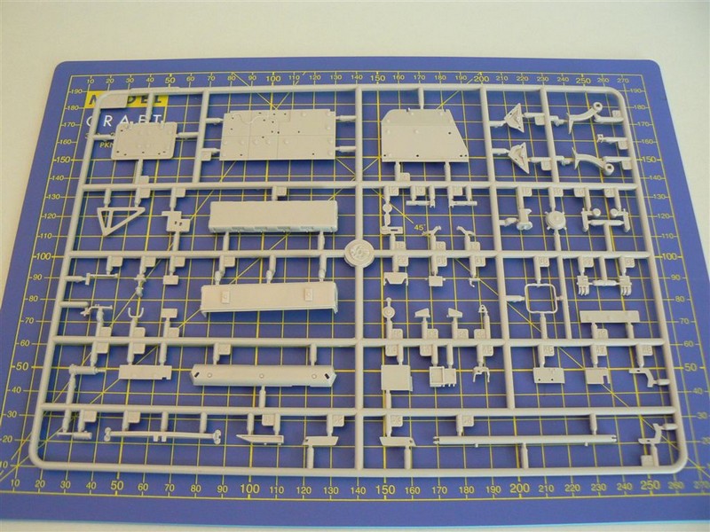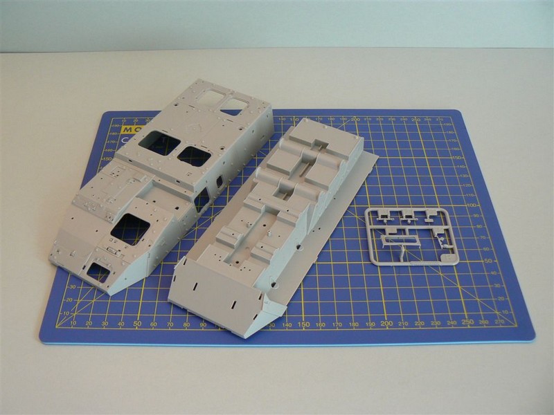 Selbstverständlich sind alle Gussäste in Klarsichtfolie verpackt. Besonders zerbrechliche Teile, sind noch mal mit Luftpolster-Folie geschützt. 744 Einzelteile sind zu verbauen. Zuzüglich einer sinnvollen Ätzteilplatine die dem Bausatz beiliegt. Die Fahrzeugoberwanne weist alle spezifischen Änderungen auf, um den M 1132 zu bauen.