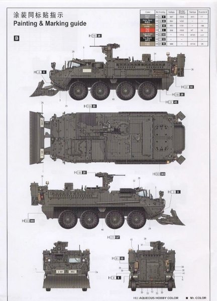 Bemalung und Decals: Wie selbst Verständlich liegt ein doppelseitiges farbiges Din A4 Blatt bei. Hilfreich für die Bemalung und zur Anbringung der Decals. Der Decalbogen erlaubt den Bau von zwei Fahrzeugen. Trumpeter geht leider nicht auf die Regimenter ein, in der die Fahrzeuge fahren. 5 Farbherbsteller werden Angegeben. Ich lackiere meine Stryker mit dem Bronze Grün XF-67 von Tamiya was ich für sehr stimmig halte.