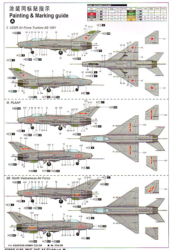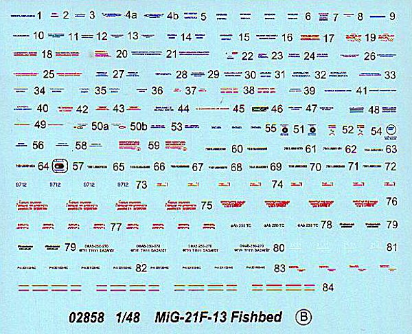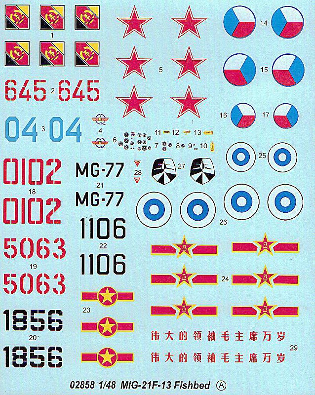 Bemalungsvarianten: Es liegen Decals für eine sowjetische, chinesische, vietnamesische, tschechoslowakische, finnische und deutsche MiG bei. Diesmal stimmen die DDR Hoheitsabzeichen, dafür sind die Zahlen völlig unbrauchbar. Warum haben hier die Kopierweltmeister nicht einfach bei Revell abgeguckt?