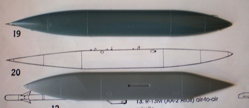 Als Außenlasten liegen je zwei R-3S, R-3R, UB-32 sowie je zwei Zusatzbehälter 490 l und 800 l bei. Hiervon sind nur die Raketen und der kleine ZB - trotz geringfügiger Maßabweichungen - verwendbar.
