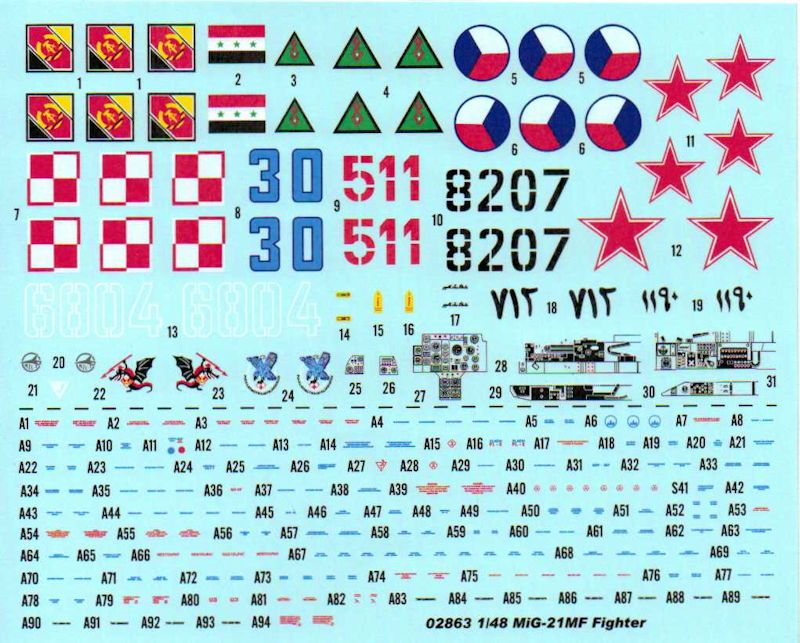 Bemalungsvarianten: Für das Abschlussfinish werden in der Bauanleitung sechs farbig gedruckte Dekomöglichkeiten angeboten. Die Wartungshinweise sind ausreichend. Es liegen Decals für eine sowjetische, polnische, tschechische, NVA und zwei irakische MiG bei. Angaben zu den Maschinen fehlen.