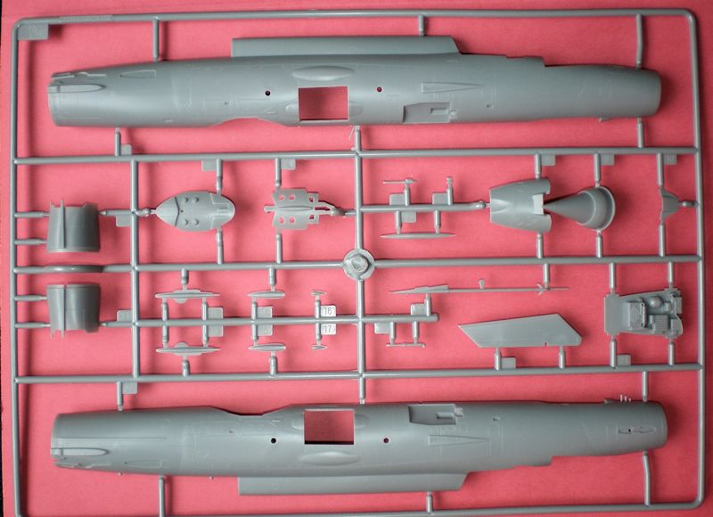 Bausatz: Trumpeter bringt nach der 32er MiG jetzt die MF in 1/48. Im randvollen Karton liegen separat verpackt zehn graue und ein Klarsichtrahmen mit ca. 180 Teilen, eine Platine, ein Decalbogen und die s/w Bauanleitung. Diese führt in 20 Schritten durch den Bau.