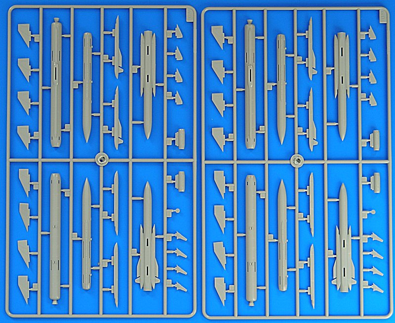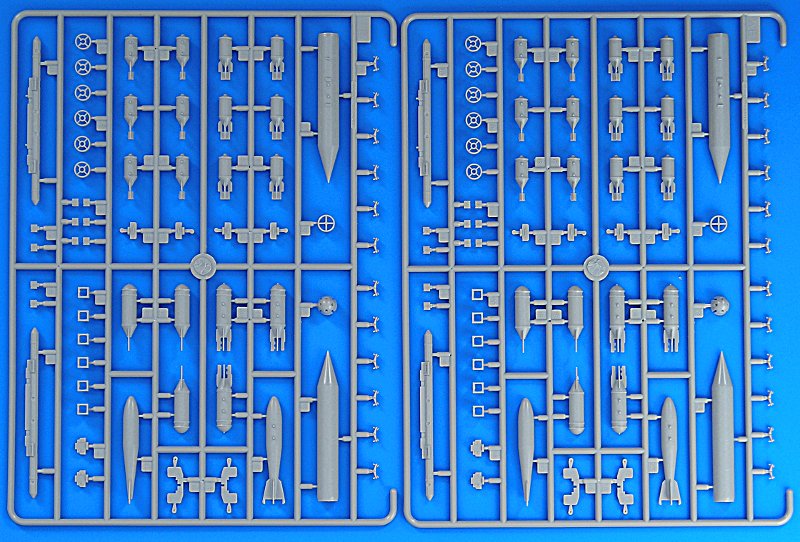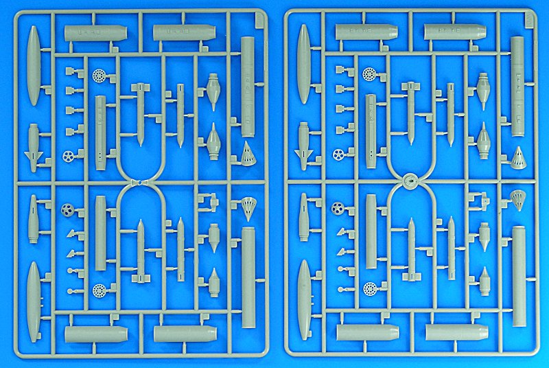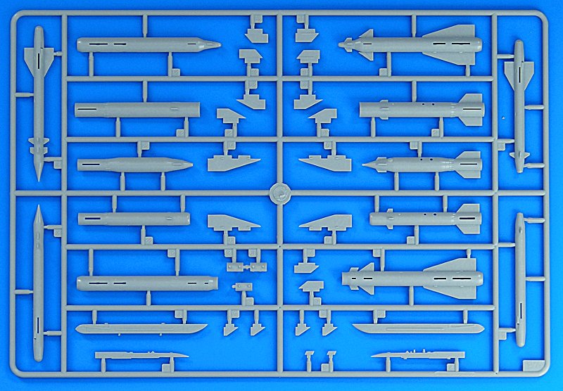 Doch zurück zum Bausatz. Neben den Teilen für das Flugzeug enthält dieser eine schier unüberschaubare Anzahl von Abwurfwaffen und Raketen. Hier fällt die Auswahl der gewünschten Bewaffnungsvariante schon schwer, ist aber auch von der Bemalungsvariante und damit dem Einsatzzweck abhängig. Ein Blick in die Literatur und das WWW hilft hier hoffentlich weiter. Die Waffenspritzlinge liegen übrigens alle zweimal bei, sind hier meist jedoch nur einmal abgebildet..