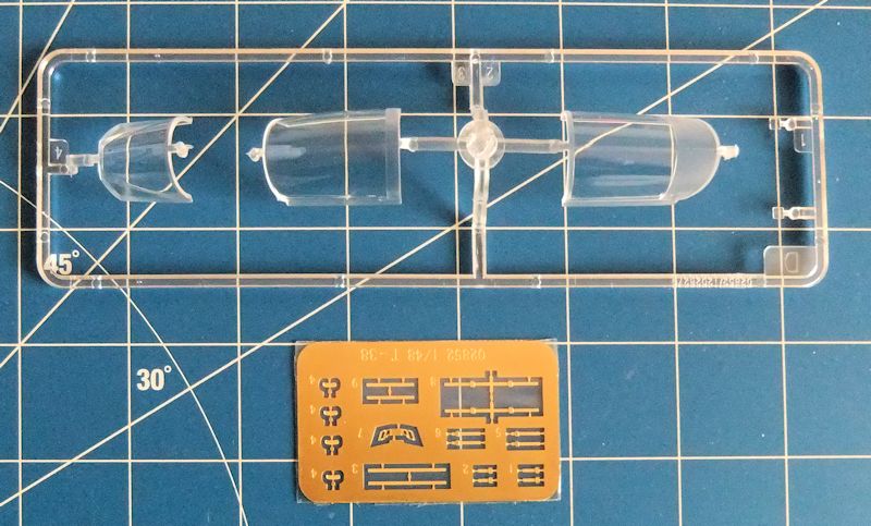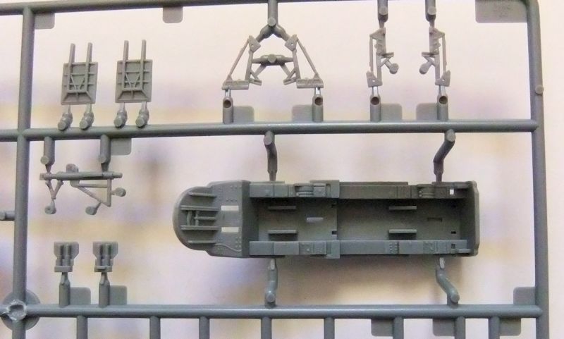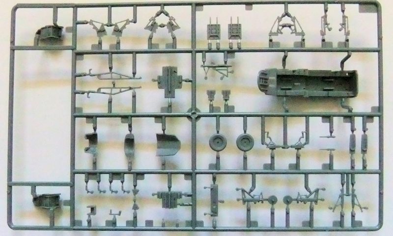 Bausatz: Der Bausatz selbst besteht aus etwa 100 mittelgrauen Kunststoffteilen, plus einem Rahmen mit Kabinenteilen. Außerdem gibt es noch eine kleine Platine mit Messingätzteilen für die Gurte der Besatzung und den Rückspiegeln, die an den Kabinenrahmen angebracht sind. Die Gravuren entsprechen dem heutigen Standard. Das heißt: Fein versenkt und dem Maßstab entsprechend in Schärfe und Tiefe angepasst. Der berüchtigte "Gott der Nieten" hat China wohl endgültig verlassen, oder ist im Trumpeterwerk eingemauert worden.