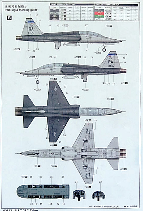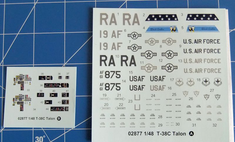 Auch die Details sind auf Höhe der Zeit. Besonders das Cockpit ist wunderbar gestaltet. Schalter, Knöpfe und Instrumente, mit Decals, sind gestochen scharf ausgearbeitet. Die Sitze sind einfach. Das entspricht aber auch dem Original. Die besagten Gurte werten sie auch noch auf. Besonders wichtig ist, das Trumpeter an den auffälligen Mechanismus für das Öffnen der Hauben gedacht hat. Ebenso wichtig: die Detaillierung der Fahrwerksschächte und der Luftbremsen.(Speed Breaks). Auch hier hat sich Trumpeter Mühe gegeben. Alles in allem also ein toller Bausatz im 48er Bereich, der das gar nicht mal so kleine Modell der T-38 C sehr gut wiedergibt.