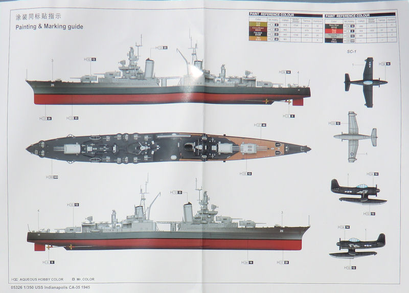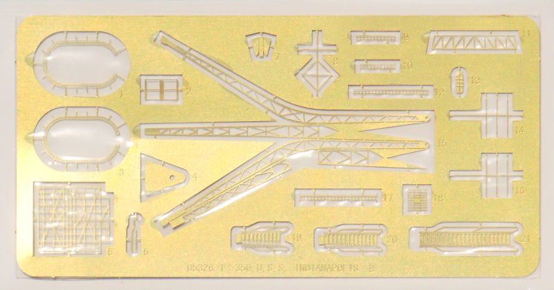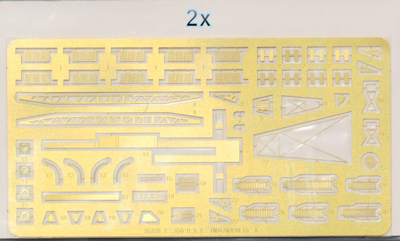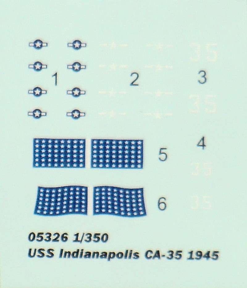 Bausatz: Nach Indianapolis von ACADEMY gibt es auch einen Bausatz von TRUMPETER zum Thema. Hier gibt es eine USS Indianapolis im Bauzustand 1945. In einem passenden randvoll gefüllten Stülpkarton befinden sich gut verpackt 15 graue Spritzlinge, zwei klare Rahmen mit 630 Teilen, drei Fotoätzteilbögen, ein Decal, die mehrfarbige Bemalungsanitung und die übersichtliche Bauanleitung. Die Teile entsprechen dem aktuellem TRUMPETER-Niveau. Sehr bruchsicher sind viele empfindliche Teile am Rahmen verpackt.