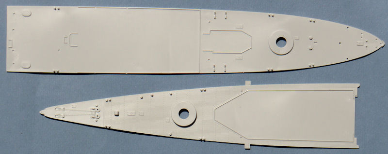 Der Rumpf wird mittels sieben Schotten verstärkt. Das Hauptdeck besteht aus zwei Teilen. Im vorderen Bereich gibt es eine Holzstruktur. Viele kleine Treppen werden aus Fotoätzteilen aufgebaut. Diese Metallteile kommen auch bei den Schutzgittern an den Schornsteinen zum Einsatz. Es versteht sich daher von selbst, dass TRUMPETER auch geätzte Antennen mitliefert. Natürlich sind die Gitterteile des Katapults aus geätzten Metall.
