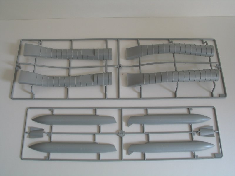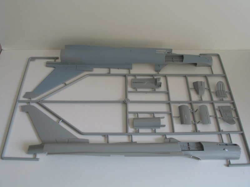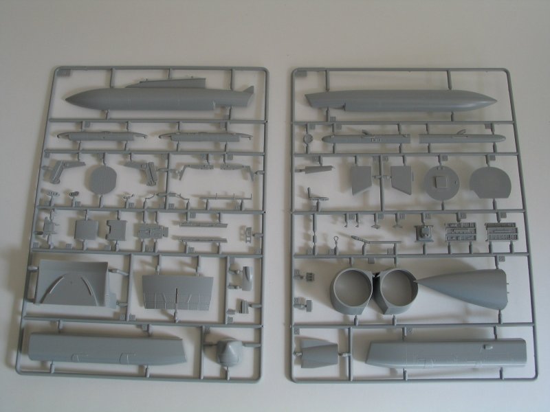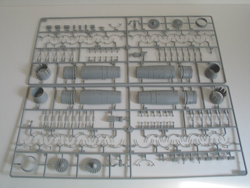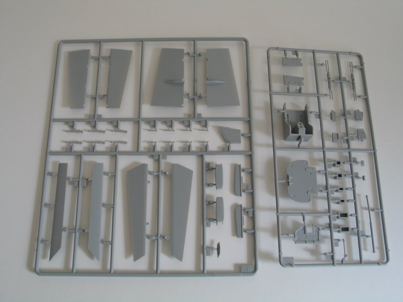 Bausatz: Beim Öffnen des Kartons fallen einem die vielen Spritzlinge auf, an denen 462 Teile verteilt sind. Den Bausatz liegen zwei Eurojet 200 Triebwerke mit den kompletten Lufteinläufen bei. Nach dem Einbau in den Rumpf sieht man leider davon nicht mehr viel. An den Tragflächen können die Vorflügel ausgefahren dargestellt werden.