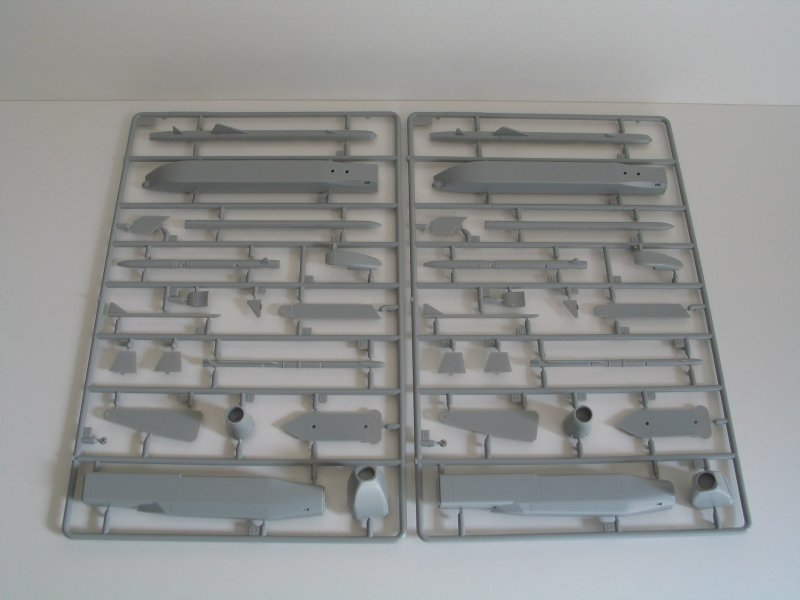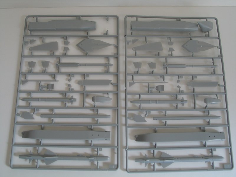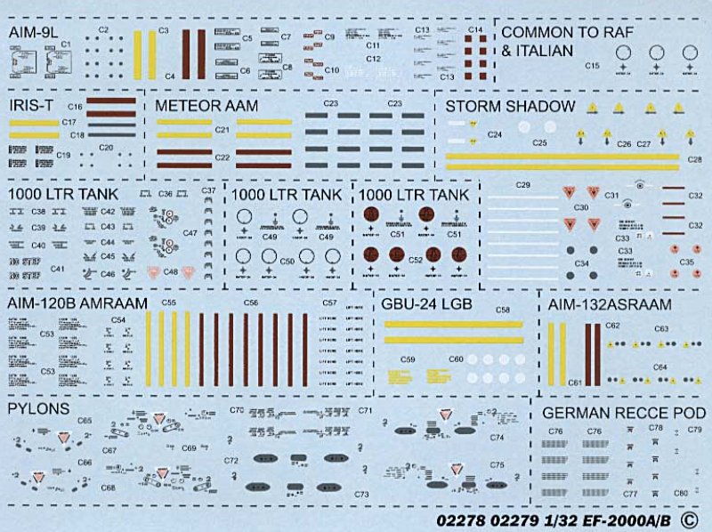 Dem Trumpeter Eurofighter Modell liegen drei 1000-Liter Zusatztanks und einige Waffen bei. Wie der IRIS-T x2, AIM-132 ASRAAM x2, der AMRAAM und METEOR. Von letzteren leider jeweils nur 2, braucht es doch hier 4 Stück. Auch Abstandswaffen wie der STORM SHADOW und TAURO, wie er von der Luftwaffe verwendet, liegen bei. Dieser wird aber nur von der Jagdbomberversion verwendet, mit der zwei Jagdbombergeschwadern ausgerüstet werden. Auch ein Aufklärungsbehälter liegt dem Bausatz bei.
