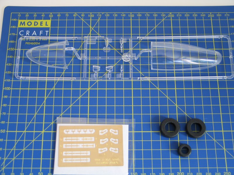 Das Cockpit ist ausreichend detailliert. Die Instrumentenpaneele müssen nicht lackiert werden. Für die Darstellung der Instrumente liegen Decals bei. Auf einer Ätzteilplatine befinden sich Gurte für den Martin Baker Mk.16A Schleudersitz. Rückspiegel sind für die Cockpithaube gedacht. An die obligatorische Gummibereifung ist auch gedacht worden.