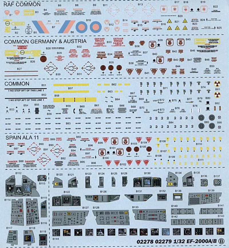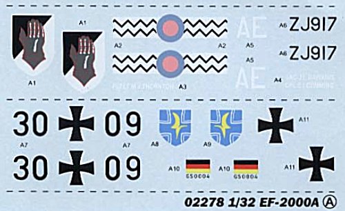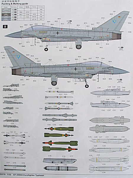 Die Wartungshinweise scheinen komplett zu sein. Auf einem Doppelseitigen Blatt finden sich alle Hinweise zur Anbringung der Decals. Mehrere Farbenhersteller sind angegeben. Leider fehlen die Federal Standard Nummern komplett. Hier ein Lackierungstipp von mir. Da ich auf Life Color Farben schwöre benutze ich zur Lackierung des Eurofighters der Luftwaffe den Farbton FS 35237 French Blugrey. Dieser Farbton muss noch mit Weiß aufgehellt wird.