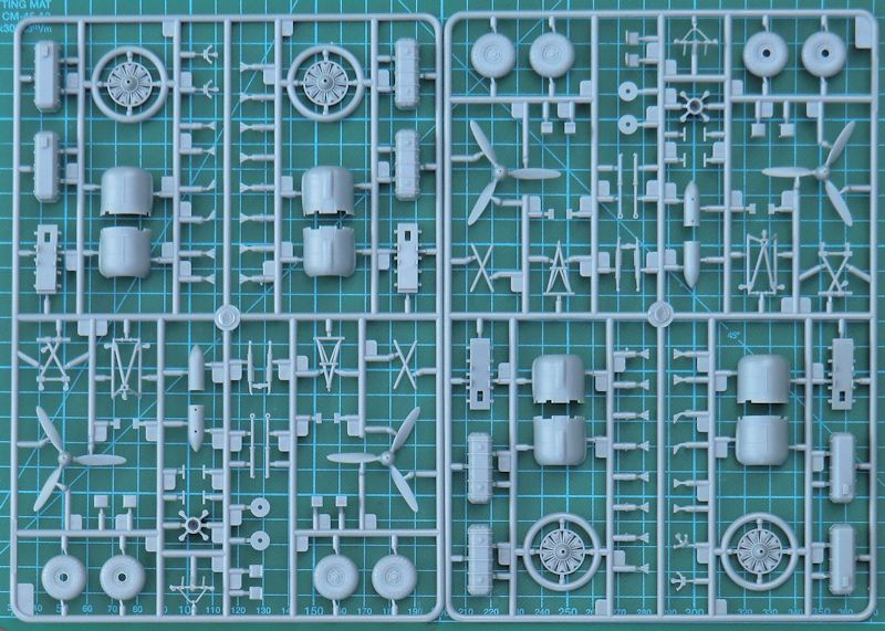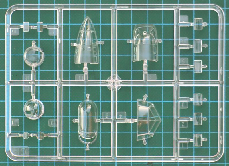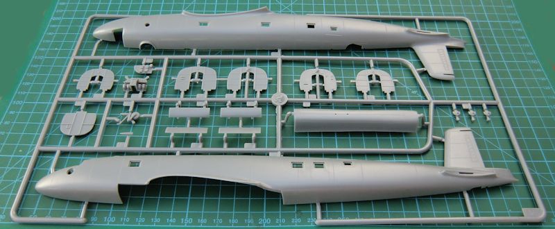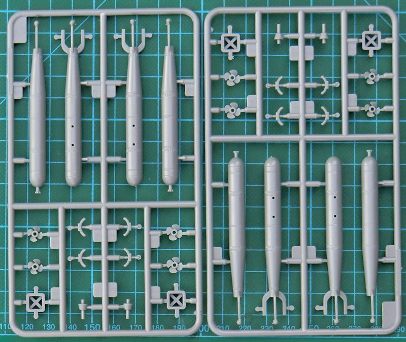 Der A-Drehstand hinterm Cockpit wirkt im Vergleich zu den Fotos etwas zu hoch. Der hintere Stand ist nicht ganz geschlossen. So schaut der MG-Lauf heraus. Die Breite wirkt stimmig. Von den BRAMO-Motoren sieht man nur den auf einer Platte aufmodellierten Stern. Die lange Rumpfwanne hat in der Mitte, wie das Vorbild, keine Fenster. Als Abwurfwaffen gibt es drei(!) Torpedos. Auf dem Bausatzcover wird ein Aufklärer mit Zusatztanks dargestellt. Die Zusatztanks liegen leider nicht bei.