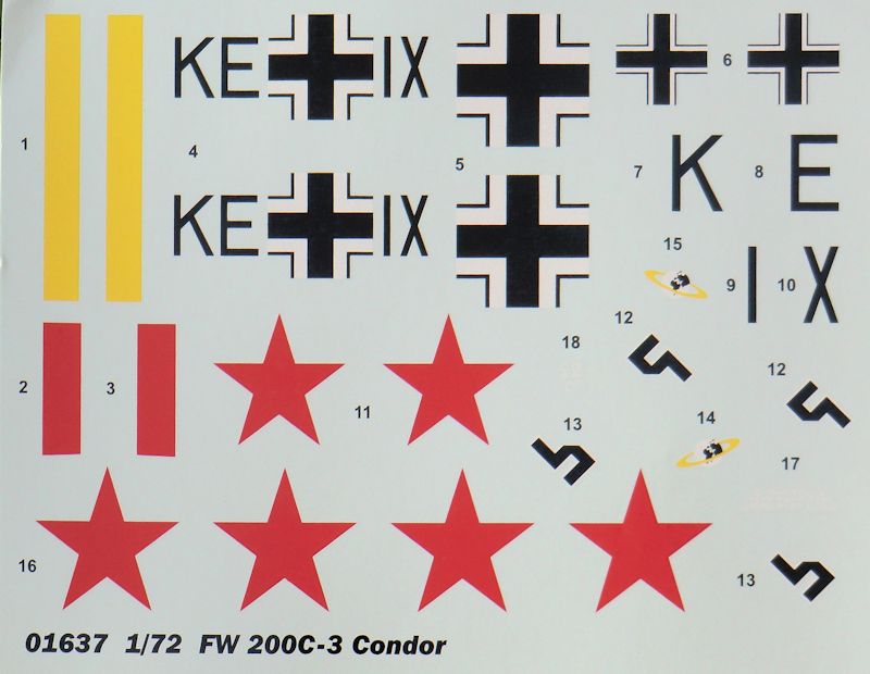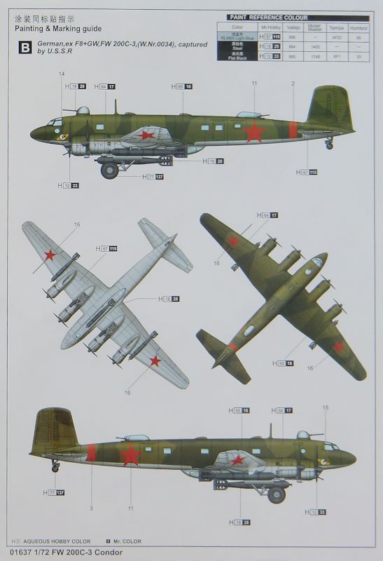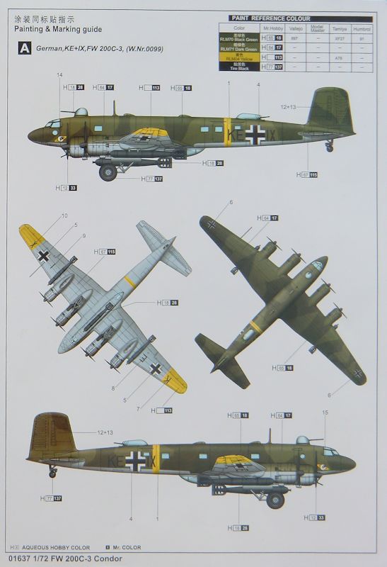 Die Farbhinweise sind verbal in Chinesisch und Englisch sowie in RLM-Tönen angegeben. Es wird auf die Farbsysteme von Mr.Hobby, Vallejo, ModelMaster, Tamiya und Hombrol verwiesen. Bei den Decals gibt es nur die großen Kennungen. Leider hat man etwas ungewöhnliche Vorbilder für eine Torpedos tragende Maschine herausgesucht.