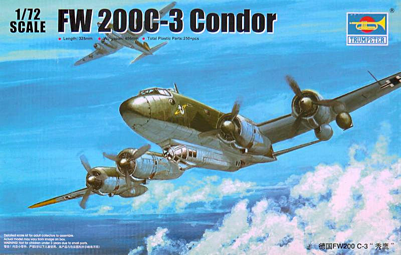 Bausatz: Seit gut zehn Jahren war die Focke Wulf Fw 200C-3 bei TRUMPETER angekündigt. Nach der etwas missglückten 200 in 1/48 war ich durchaus gespannt, wie dieser Bausatz sich schlägt. Revell hatte vor einigen Jahren einen durchaus brauchbaren Bausatz vorgelegt, der nicht frei von Macken war. So liefert TRUMPETER für unter 40 € in einem Stülpkarton gut verpackt acht hellgraue Spritzlinge mit ca. 240 Teilen, einen Klarsichtrahmen mit 16 Teilen, ein Decalbogen, die mehrfarbigen Bemalungsanleitungen und die Bauanleitung.