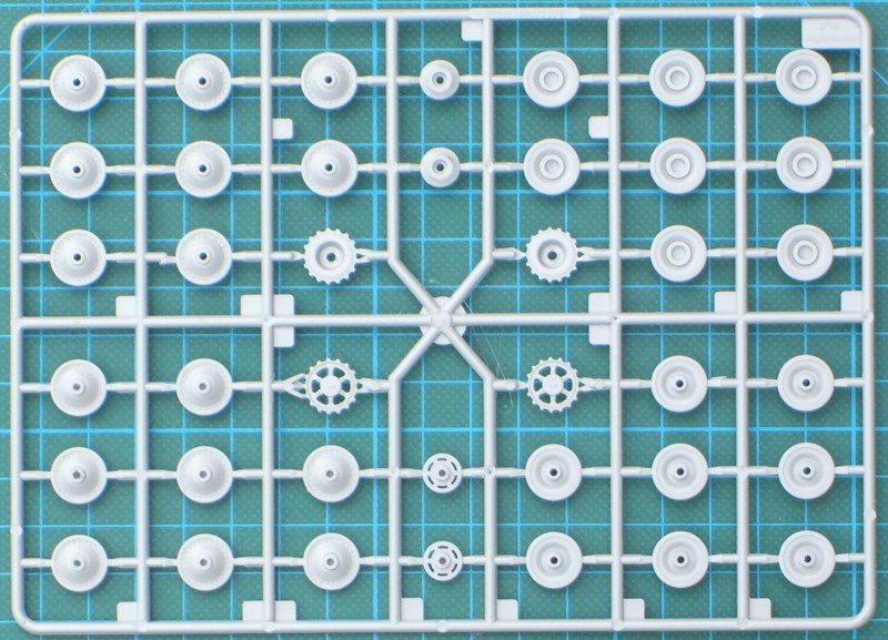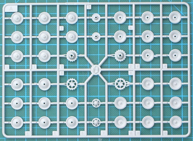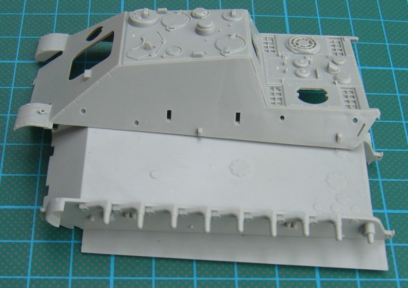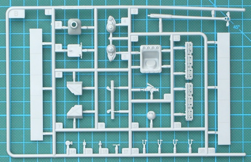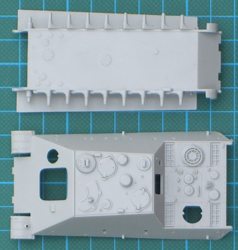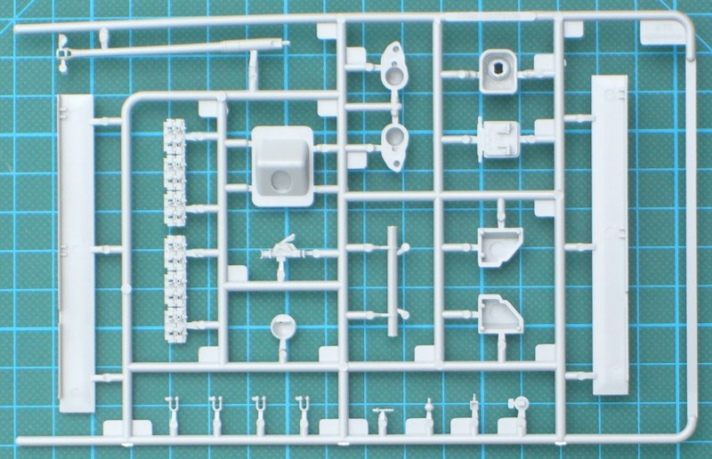 Beim Öffnen den Bausatzen fallen gleich die schwarzen einteiligen Gummiketten auf. Eine Verbindung zur Probe zeigt aber schnell, dass die Verbindungsstelle nicht aufträgt. Die übersichtliche Bauanleitung zeigt sehr schön die Montage der gut modellierten und detaillierten Bauteile. Ein separater Spritzling enthält die für die mittlere Ausführung spezifischen Teile. Die Auspufföffnungen besitzen eine leichte Vertiefung die die Öffnung des Originals darstellen soll. Sehr gut gemacht. Abgesehen davon bestehen sie jeweils nur aus einem Teil. Abdeckungen für die Auspuffanlage gibt es nicht. Die Schürzen gefallen mir, denn sie sind zu den Kanten abgeflacht und dadurch wirken sie sehr vorbildgetreu.