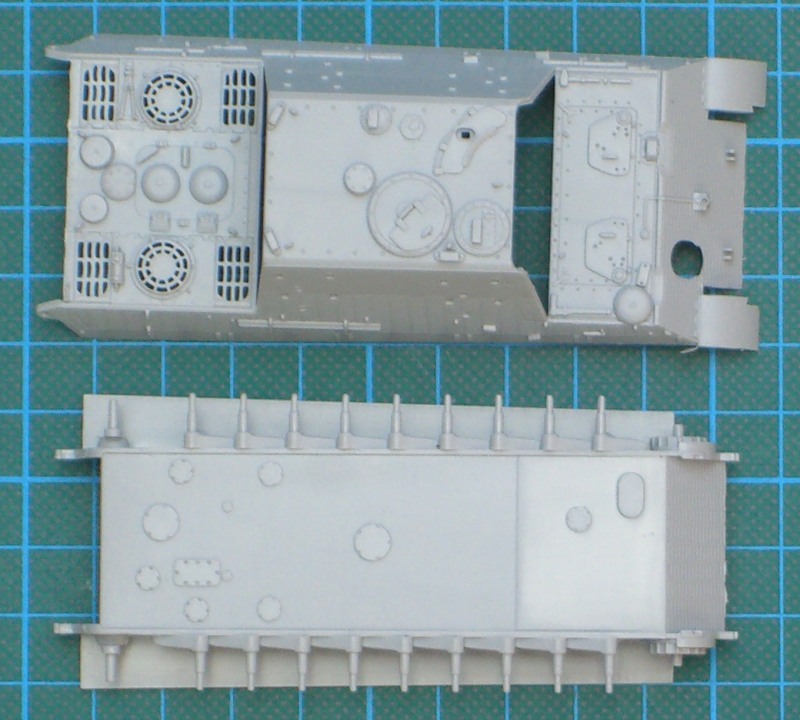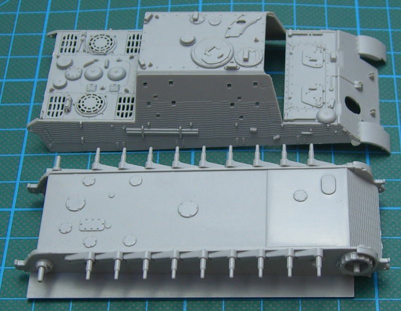 Ober-, Unterwanne und das Heckteil sind mit Strukturen versehen, die den Zimmeritanstrich darstellen sollen. Die Ausführung ist für diesen Maßstab gut gelungen. Negativ fielen mir sofort die Vinylketten auf. Die besitzen auf der Innenseite nur einfachste Strukturen. Das Verkleben und Bemalen dieser Ketten ist nicht unproblematisch. Wer hat und möchte, der kann ja einen Revell-Tiger II "schlachten" oder bei der Abt. X nachfragen.