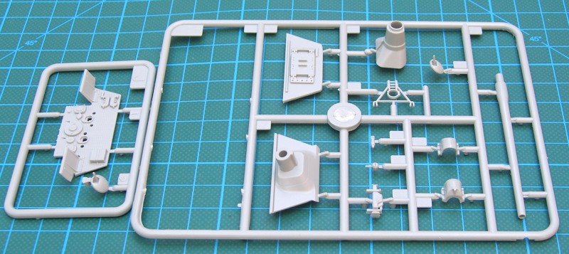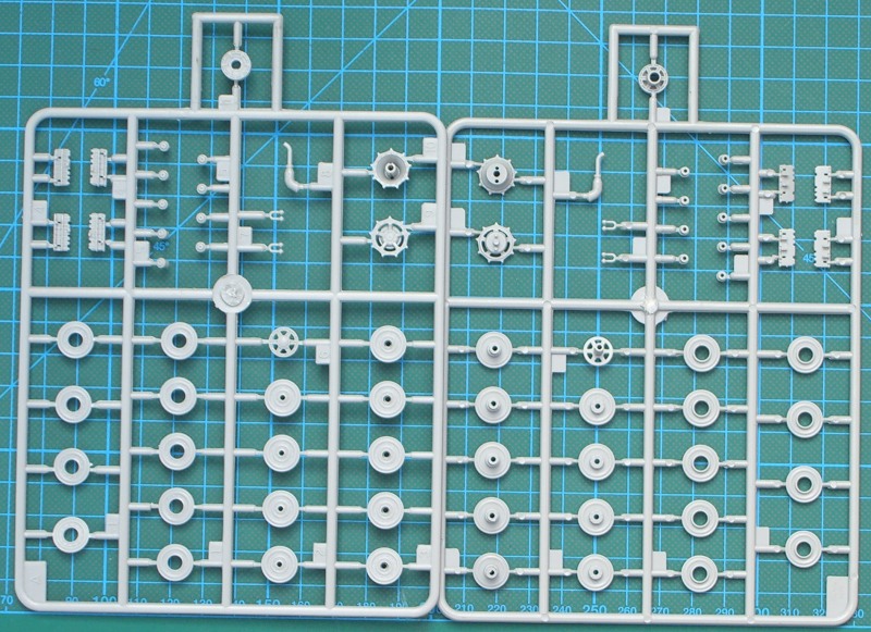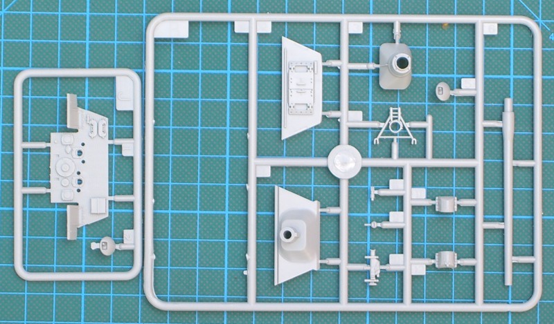 Der modellbauerfreundliche zweiteilige Karton enthält gut verpackt vier unterschiedlich große hellgraue Spritzlinge, die Unter- sowie Oberwanne, zwei Vinylketten, einen kleinen Decalbogen und die Bauanleitung. Ein paar englischsprachige Hinweise zum Original befinden sich auf der Außenseite des Kartons.
