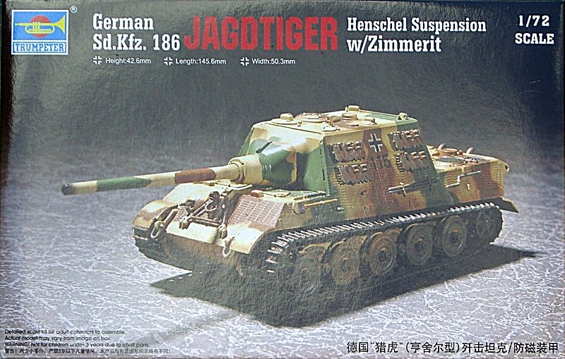 Bausatz: Der späte Jagdtiger ohne Zimmerit erschien in 1/72 bei TRUMPETER schon vor einiger Zeit. Es gab diesen Bausatz auch in beiden Fahrwerksversionen. Dragon hat(hatte) ebenfalls einen Jagdtiger mit Zimmerit im Programm.